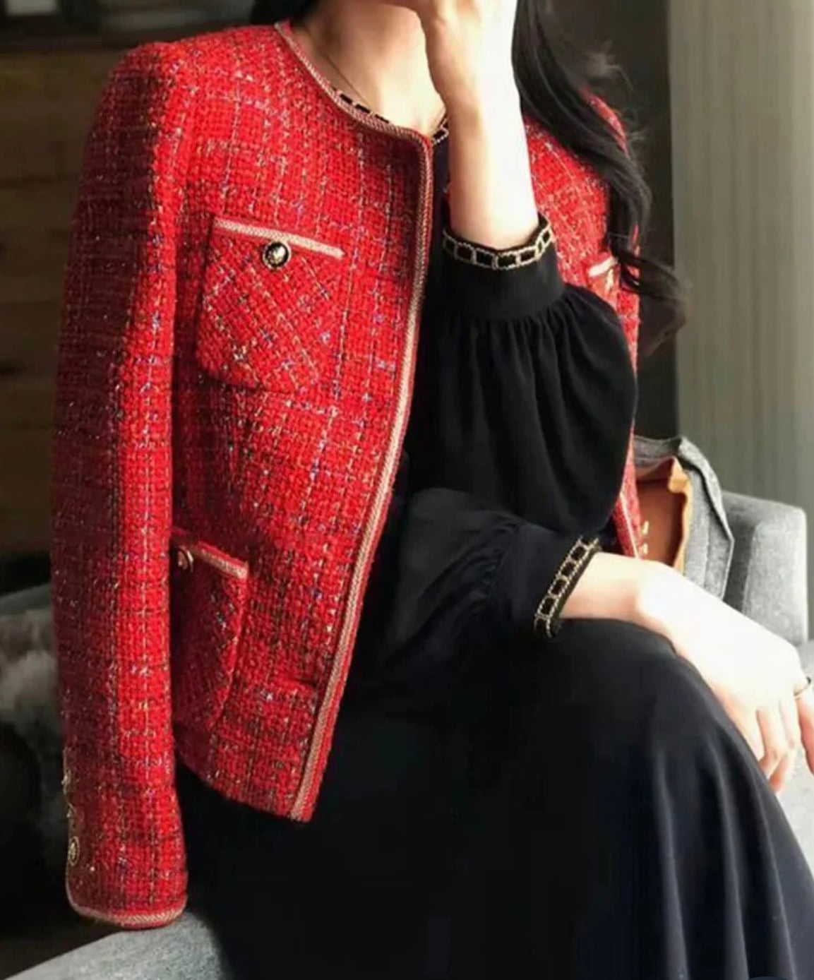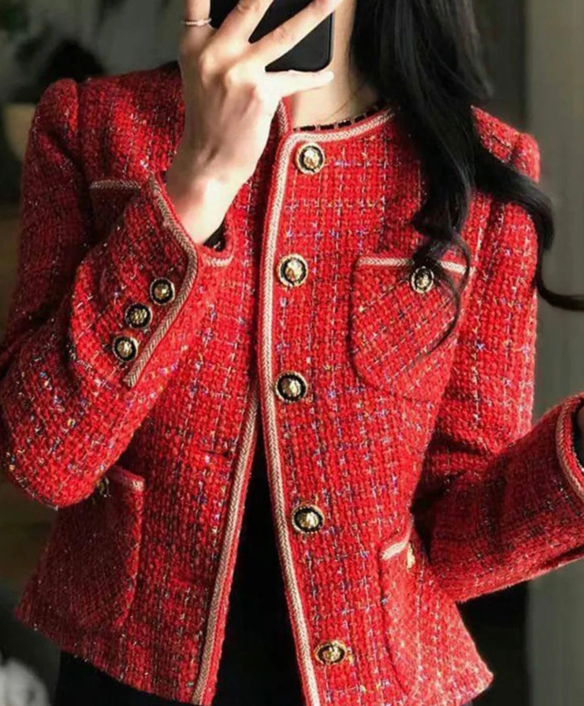 Scarlet Red Tweed Blazers Women New Autumn Winter Loose O-Neck Single-Breasted Suit Jacket