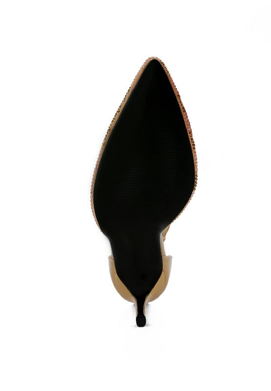 The High Heeled Sandals with patent pu at the back which shines just right has detailing on the soft microfiber with sparling diamantes are treat to the feet.